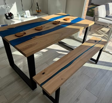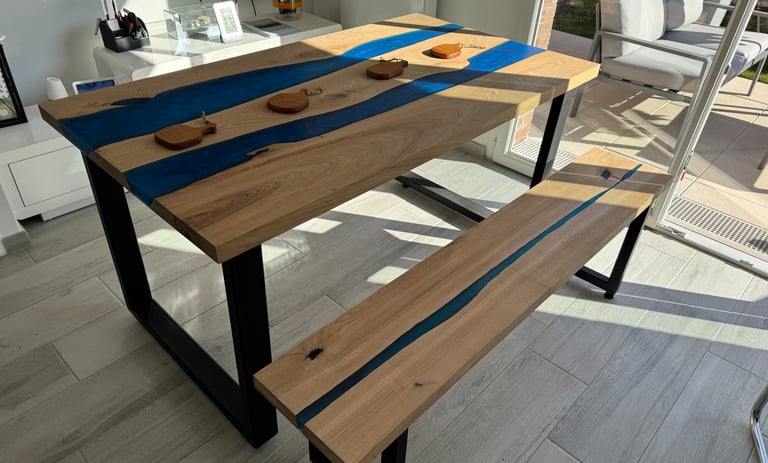 Des tables artisanales en bois massif, sublimées par la résine époxy et entièrement personnalisables.